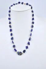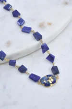 This stunning piece features a blue Mojave copper turquoise pendant set in a 14k gold bezel, elegantly displayed on a vermeil and sapphire stone chain with a magnetic clasp closure. Perfect for everyday wear or special occasions.