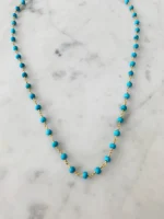 Experience elegance with the Balmy Nights Station Necklace in Turquoise with Gold. This exquisite piece features a turquoise beaded design set on a 14k gold chain.