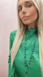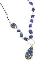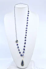 Introducing the stunning Kaylee in Blue Mojave Copper Turquoise Necklace, a versatile and fashion-forward accessory that adds a touch of elegance to any outfit. This long-style necklace features mesmerizing blue copper turquoise pendants and a sapphire chain, offering a multitude of styling options.