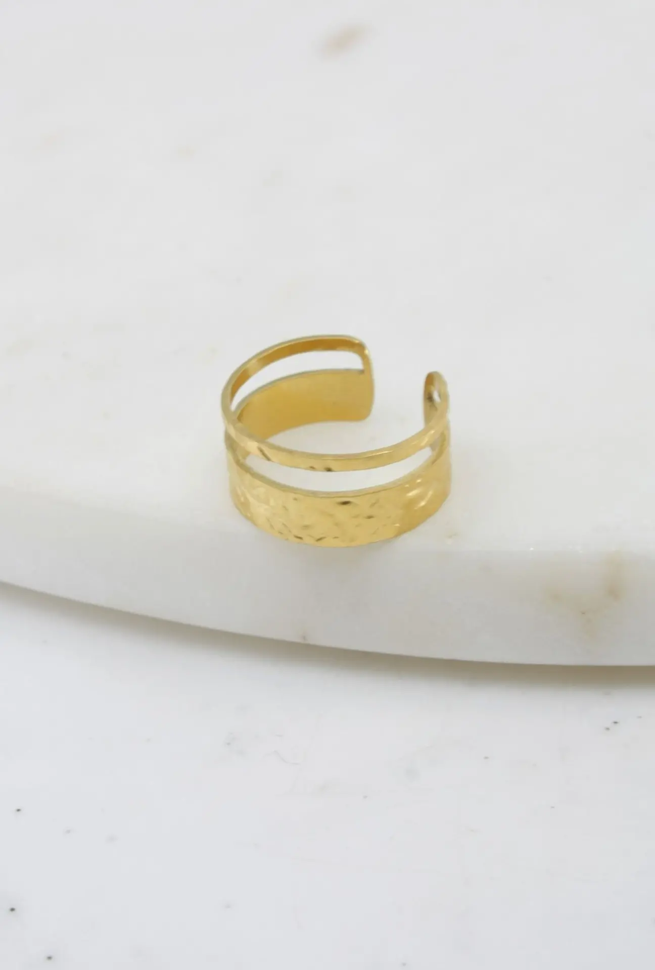 Enhance your jewelry collection with the Double Band Gold Accent Ring. This stunning piece features an adjustable hammered design with a sophisticated split wide band, adding a touch of elegance to any outfit.