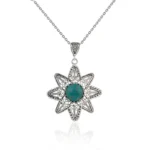 Indulge in the bohemian charm of our handcrafted Filigree Art Turquoise Gemstone Sunflower Design Silver Pendant Necklace. This exquisite necklace features a stunning sunflower design adorned with a 10.00 mm cabochon round cut turquoise gemstone. The intricate filigree art adds a touch of elegance and uniqueness to this one-of-a-kind piece.