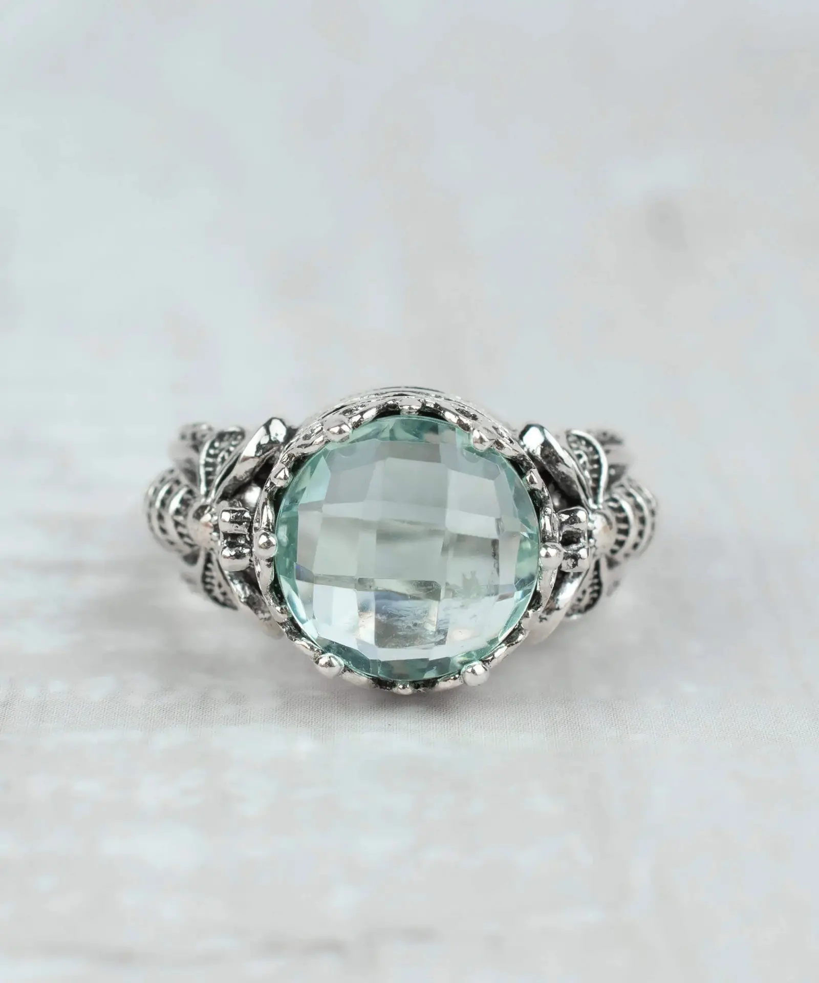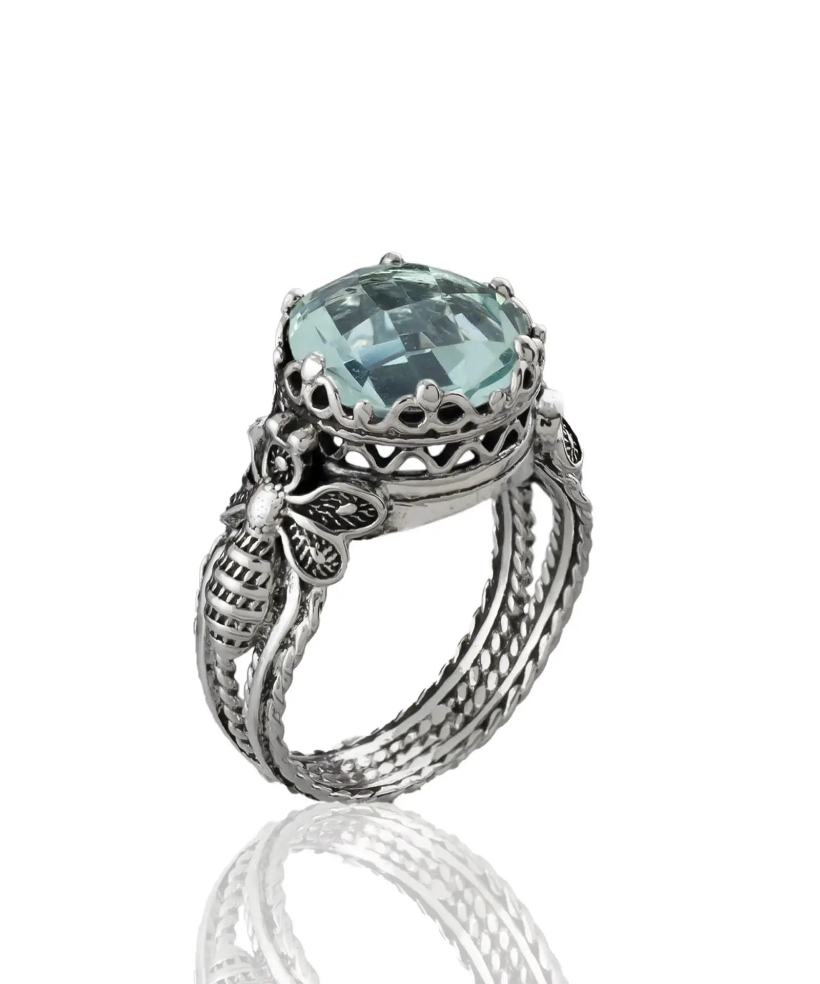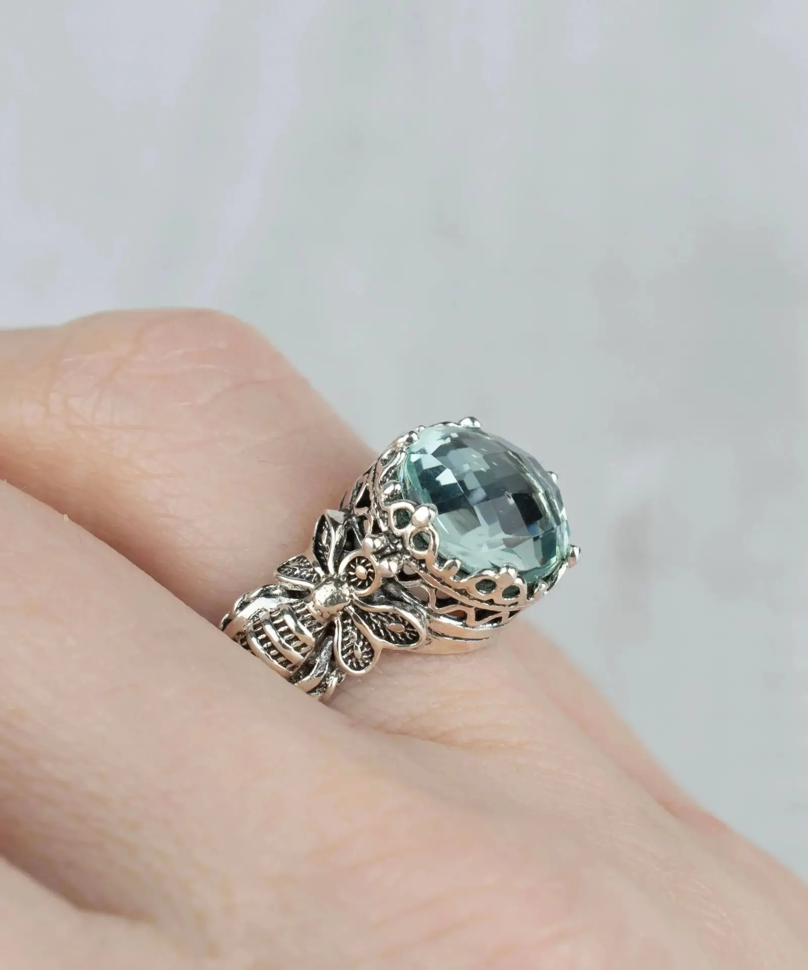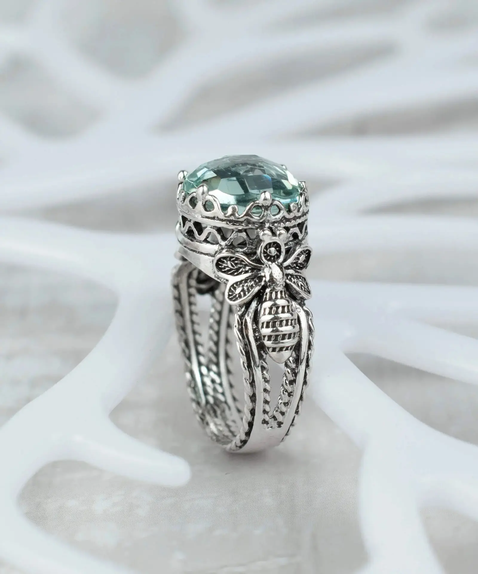 Looking for a perfect gift for the special women in your life? Look no further than this stunning silver filigree queen bee detailed cocktail ring. Handcrafted by skilled artisans, this ring features intricate details and a beautiful face-up design that is sure to impress. The double side faceted checkerboard round-cut aquamarine gemstone is 10mm and 0.47″/12.00mm face size, making it a stunning addition to any outfit.