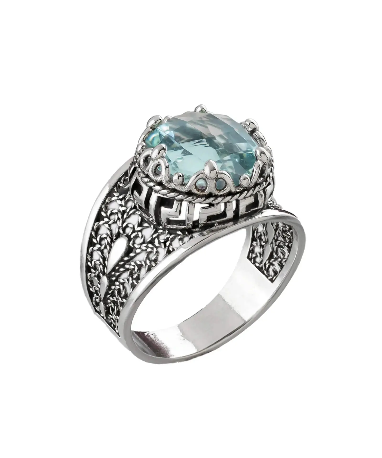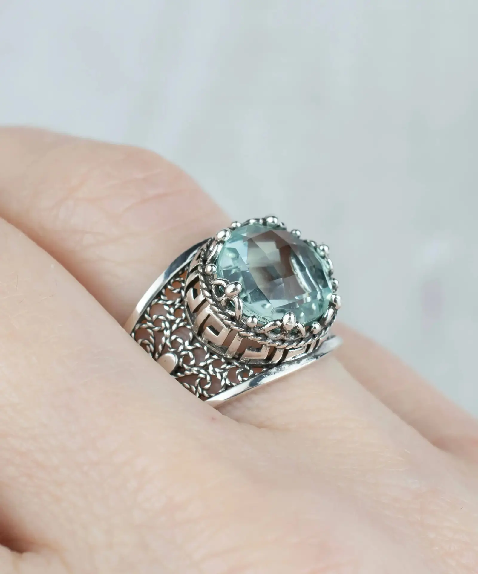 Add a touch of elegance to your look with the Meander Pattern Filigree Art Aquamarine Gemstone Women Silver Cocktail Ring.