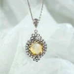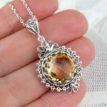 Add a touch of sunshine to your wardrobe with this stunning handcrafted filigree art citrine gemstone women’s silver boho pendant necklace. The natural November birthstone citrine gemstone, measuring 12mm and cut into a faceted round shape, shimmers beautifully in the light, making it an eye-catching accessory for any outfit.