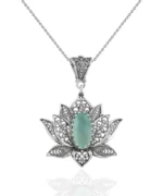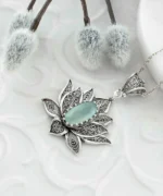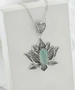 Enhance your style with our exquisite handcrafted Filigree Art Aqua Chalcedony Gemstone Blossoming Lotus Flower Women Silver Pendant Necklace. This stunning piece of jewelry features a beautiful aqua blue chalcedony gemstone, cut into a faceted oval shape, measuring 7.00×14.00 mm. The pendant itself is shaped like a blossoming lotus flower, with dimensions of 1.70 inches in height and 1.20 inches in width.