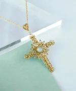 Inspired by the centuries-old technique of filigree art, this cross pendant is a breathtaking work of art that originated in Mesopotamia and Anatolia. Its intricate design and exquisite gemstone make it a must-have accessory.