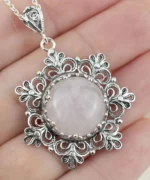 Indulge in the artistry of our Filigree Silver Flower Figured Rose Quartz Gemstone Pendant Necklace. Meticulously handcrafted with 925 sterling silver, this necklace showcases intricate filigree details that are a testament to the exceptional skill of our artisans. With its unique design and delicate pink hues, this necklace is a graceful and sophisticated accessory that will elevate any outfit.
