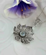 Introducing our stunning handcrafted filigree art lotus flower pendant necklace, featuring a dazzling blue topaz gemstone. Made of high-quality 925 sterling silver, this necklace exudes elegance and sophistication. The pendant measures 1.75 inches in height and 1.20 inches in width, showcasing the beautiful 6.00 mm round-cut blue topaz gemstone.