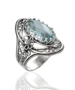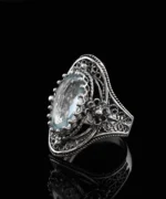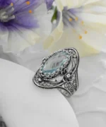 Marvel at the intricate filigree artistry showcased on the Blue Topaz Oval Ring. This exceptional technique, originating from Mesopotamia and Anatolia, weaves delicate metal strands together to create a mesmerizing combination of old-world charm and modern art. Add a touch of elegance to your ensemble with this remarkable ring.
