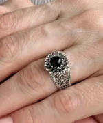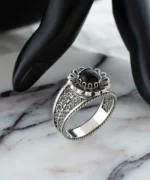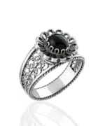 Indulge in elegance with this beautiful Daisy Figured Black Onyx Gemstone Filigree Art Women Silver Cocktail Ring. Made of 925 sterling silver, this ring features a stunning filigree bee design and a round-cut black onyx cabochon gemstone at the front.