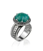 The center of attention is a 12mm round cabochon-cut natural amazonite gemstone. Known for its soothing blue-green color, the amazonite stone is perfectly set off by the ornate filigree setting. This gemstone radiates blue rays full of rejuvenating vibrations and is said to calm the heart, making it a meaningful addition to your jewelry collection.